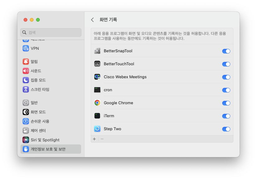 아래와 같이 설정 > 개인정보 보호 및 보안 > 화면 기록 메뉴에서 cron의 화면 기록 권한을 허용해 준다.